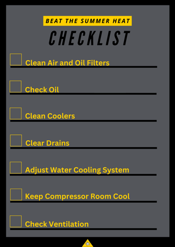Leading up to and during summer, it's all about preventative maintenance and proper ventilation. Keeping these two aspects in mind, and the maintenance and ventilation checklists below, your compressed air equipment will continue running properly as the summer heat sets in. Here are the top things to make sure you cover to prevent overheating and shutoffs: